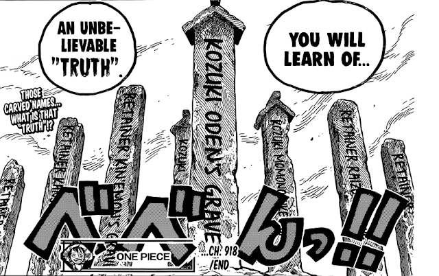 Dan kami yakin, makam tersebut hanyalah kamuflase, dan tujuannya masih belum diketahui. entah ini ulah kinemon dan kawan-kawan ataupun mungkin ulah dari Kaido agar penduduk di Wano menganggap mereka sudah mati. semoga permasalahan ini lekas terungkap di chapter 919. Oda benar-benar sangat luar biasa sekali memutar-mutarkan jalan cerita.